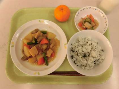 今日の給食は、わかめごはん、筑前煮、シャキシャキ野菜、ぽんかん、牛乳です。