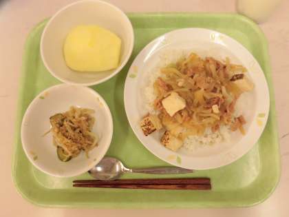 今日の給食は、豚丼、ごま酢かけ、りんご、牛乳です。