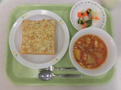 今日の給食は、アーモンドトースト、チリビーンズシチュー、ピクルスです。