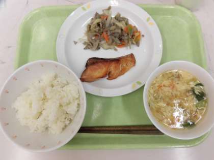 今日の給食は、ごはん、ぶりの幽庵焼き、ねぎ塩きんぴら、ささみのスープです。