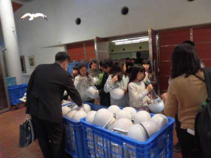 その後、一人ずつヘルメットをかぶりバスで敷地内の見学。