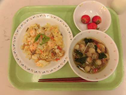 今日の給食は、ちらしずし、あんかけ汁、いちご、牛乳です。