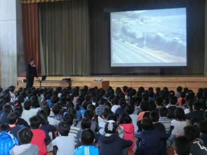 今日の朝会は、震災直後に現地に出向いて、救援活動に携わった