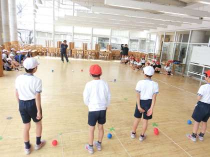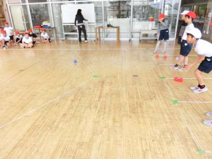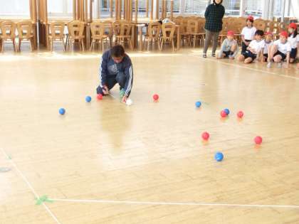 2つのチームに分かれ、白玉をめがけて赤玉と青玉を転がし合います。