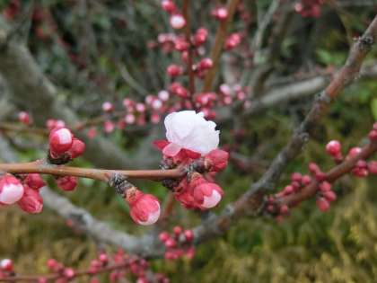 今朝の登校時に、先週までは、蕾を堅くしていた「桃の木」も