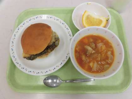 今日の給食は、和風フィッシュサンド、ボルシチ、甘夏、牛乳です。