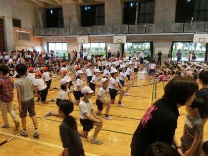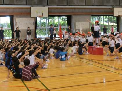 体育館に入ってくる全校児童を、