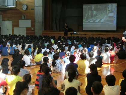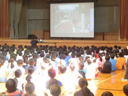 子供たちに、通学風景の写真を見せながらの説明でした。