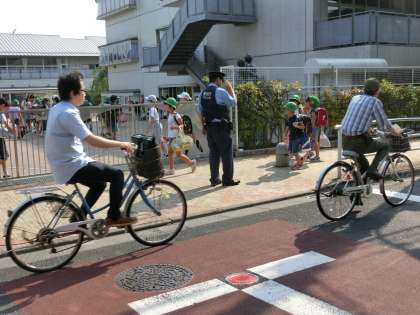 子供たちの中には、おまわりさんの敬礼のあいさつを真似て、