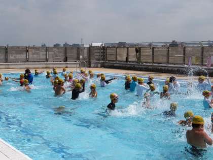 まずは、水かけっこや水中じゃんけんで水に慣れた後は、