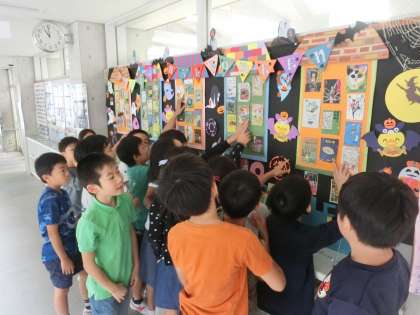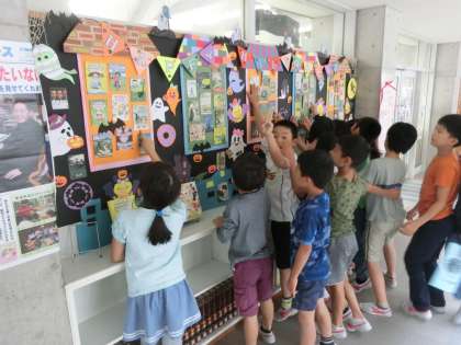 学校でも、図書室壁面装飾ボランティアの皆様が