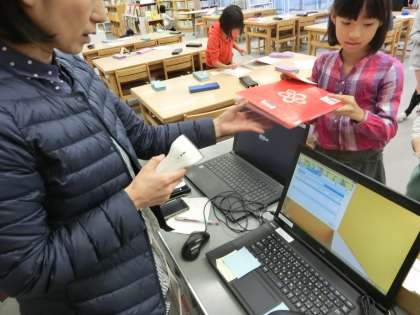 図書室での本の貸し出し、