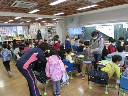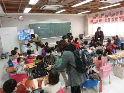 1年生と園児の皆さんとで、説明文の挿絵の順番を考えたり、