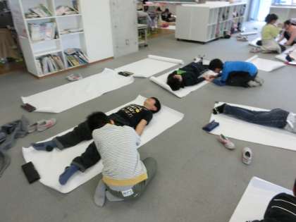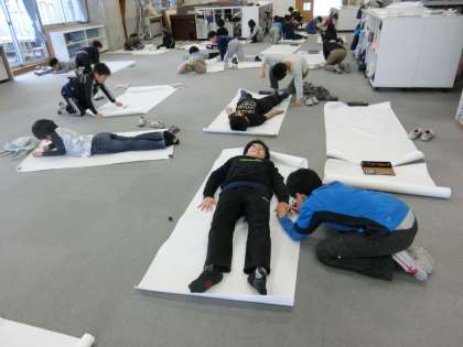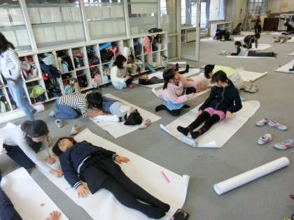 友達に鉛筆で体の線を、安心してなぞってもらっている
