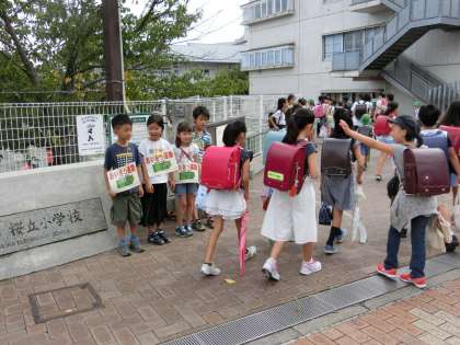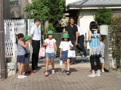 登校してくる子供たちに、