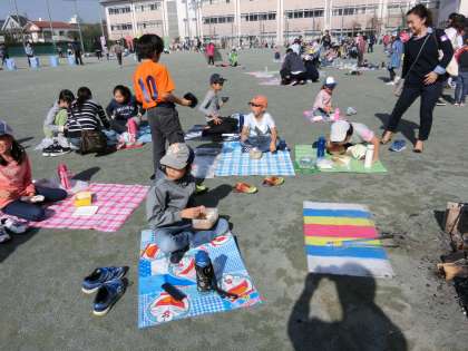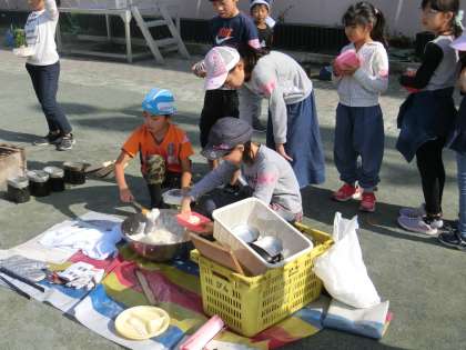 桜丘中学校の校庭に集まり、飯ごう炊さん、カレー作りを楽しみました。