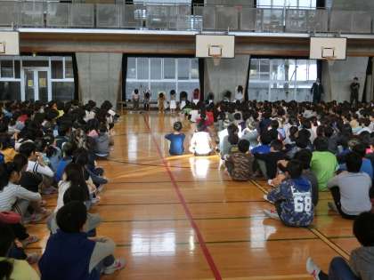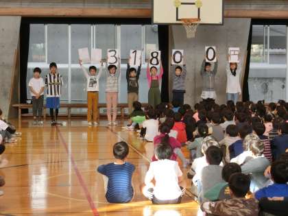 全校朝会 環境委員会からの「みどりの羽募金」報告