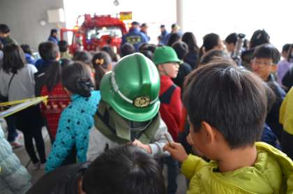 駐車場で消防車や消火に使う道具や防火服を着る体験と