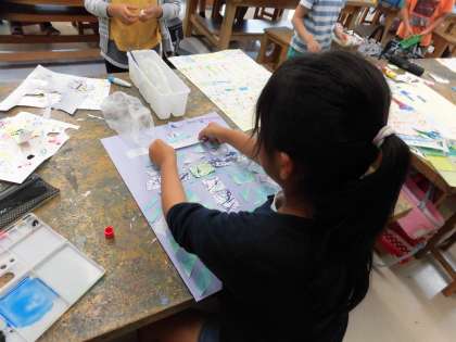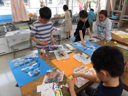 今日の授業は、前回様々な技法の絵の具遊びをしてできたカラフルな「じぶん色がみ」を作品に生かすことにしました。