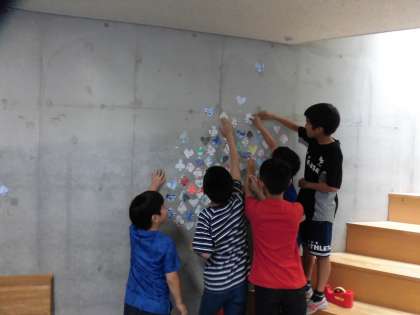 終わった人から協力をして、図工室前の壁に”アートの木”を製作しています。