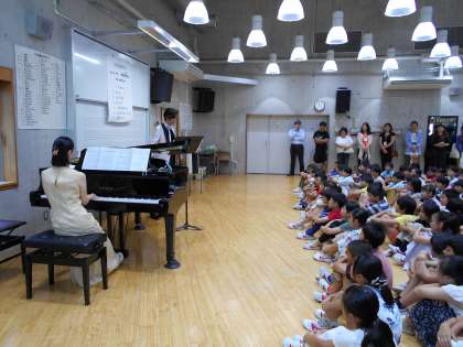 「カウンターテナー」という珍しい声の種類で、男性ですが女性のような澄んだ美しい歌声に子供たちは圧倒されていました。子供たちがよく知っている「Believe」や「もののけ姫」、日本の心の歌である「赤とんぼ」を歌っていただきました。1番から4番は同じメロディーでも表現の仕方が様々で、情景が浮かんでくるような素晴らしい歌声でした。そしてイタリア語の歌曲「この胸の高鳴りに」では、声を転がす技術に驚きました。
