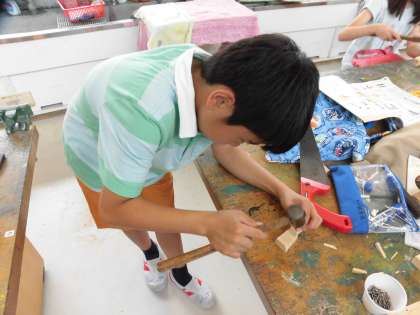 4年生の図工で、のこぎりとくぎ打ちの練習をしました。