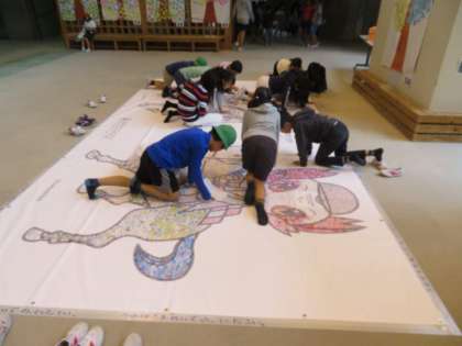 子供たちが描いた絵を集め、「モザイクアート」にし、1つの大きな作品になって、集まれ広場に掲示してあります。自分たちが描いた絵が大きな作品となり、子供たちは驚きながらも、うれしそうに絵を見ていました。休み時間になると大勢の子が自分の描いた絵を探す姿も見られました。
