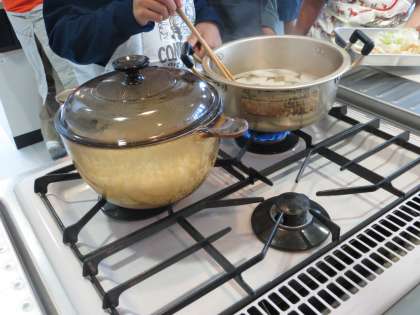 みそ汁に入れる大根や油あげなどを短冊切りしました。煮干しからだしを取り、大根の煮え具合を確認しながらみそを溶きはじめました。