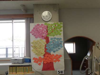 「周りの人にしてもらってうれしかったこと」「身近な人への感謝の言葉」が「思いやりの葉」に書かれていました。