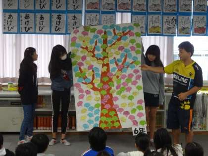 一人一人が書いた思いやりの葉には、「怪我をしたとき、手伝ってくれてありがとう」「いつも笑顔で笑わせてくれてありがとう」「一緒に遊ぼうと言ってくれたことが嬉しかった」というように、友達に対しての温かい言葉がたくさん書かれています。友達以外にも、「いつもおいしいご飯を考えてくれてありがとうございます」「教室の床をきれいにしてくれてありがとうございます」というように、家族・地域の方・先生方・主事さんなど、多くの方々に対する感謝の言葉や嬉しかった気持ちを書いている子がたくさんいます。