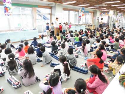 今日はフロアに集まって、学年全員で合唱をしたり、