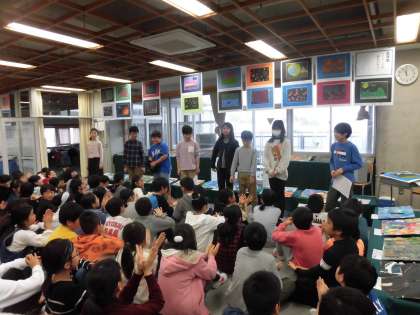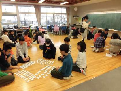 各クラスでチームを作り、4クラス対抗で勝負しました。読み札が読まれ、真剣に札を探す子供たち。たくさん短歌を覚えている子がいて、上の句でとられてしまう緊張感や、お気に入りの短歌が読み上げられるのを今か今かと待ちかまえる様子など、みんなで百人一首を楽しむ姿が見られました。