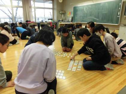 朝の雨も雪に変わった3時間目。実行委員から「みんな楽しく正々堂々と本気を出してがんばろう」と、テーマが発表され、楽しみにしていた百人一首大会が始まりました。