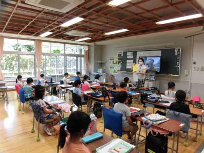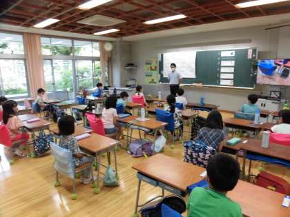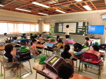 初めての教室、初めて会う友達や先生、初めて聞く桜丘小のチャイム、たくさんの初めてに、朝は少し緊張した面持ちでしたが、担任の話を聞いたり、ひらがなの勉強を進めたりするうちにだんだんと笑顔でいる子が増えていきました。