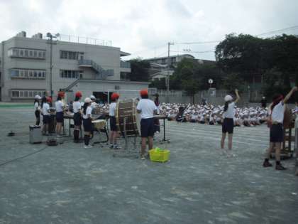 最後に整理運動と校歌の練習をしました。音楽委員の児童は、朝早くから運んで準備した楽器を一生懸命演奏しました。