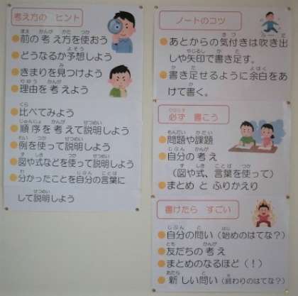 「考え方のヒント」「ノートのコツ」「必ず書こう」「書けたらすごい」など、子どもたちが授業中意識して取り組むポイントがまとめられています。