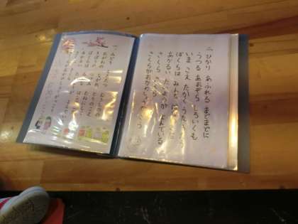 下の画像は、3〜5年生が作った校歌の歌詞です。6年生が代表して1年生の音楽ファイルに入れてくれました。
