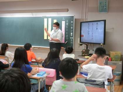 授業の導入では、いくつかの俳句の穴埋め問題を提示し、どんな言葉を入れればよいかみんなでアイディアを出し合いました。子供たちは、様々な考えを発表し作者と同じ言葉だと分かるととてもうれしそうにしていました。先生が、作者と同じでなくても工夫した表現を考えたところがすばらしいとほめていました。