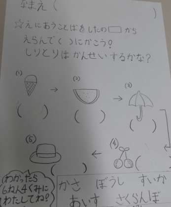 今月からは1年生のためにプレゼント作りにも取り組んでいます。外で遊べない日などに1年生が活用できる「ぬりえ」「クイズ」「線結び」などを考えました。