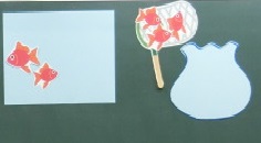 5匹の金魚から3匹とって、別の水槽に入れる場面を教具で示しました。子どもたちは実際の場面をイメージすることができ、課題の把握をしました。