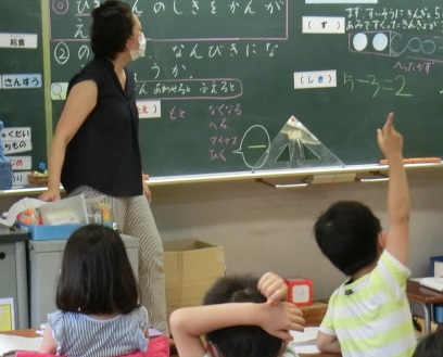 その後、考えを発表し合いました。自分の考えを説明するときにみんなに分かるようにとすすんで前に出て話す子もいます。また、説明していて分からなくなると説明を助ける子もいます。意欲をもってみんなで学習する1年生です。
