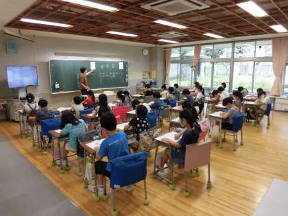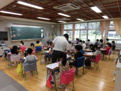 新しい漢字を学習する際、一画一画「とめ」「はね」「はらい」を伝えています。その後、みんなで手を挙げ、空書きをします。書きながら「1,2,3,4…。」と元気な声で何画目かを確認します。そして、今日学んだ漢字を用いた言葉を発表します。すすんで発表する子がたいへん多いです。今日の漢字は「楽」、子どもたちから「音楽」「楽ふ」「ごく楽」などが出てきました。
