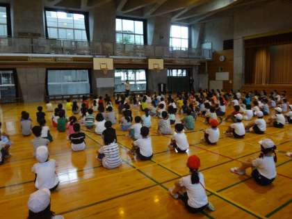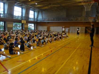初めて5クラスが集まった学年朝会。担任5人が一緒に並んでいる姿も初めて見たのではないでしょうか。2学期からの転入生の紹介、お世話になった松田先生からのお手紙、3年生としての学校生活、そして運動会など、どの話にもしっかりと耳を傾ける子どもたち。松田先生からのお手紙には、子どもたちの力強い字、思いのこもった内容への感謝や成長への喜びがたくさん書いてありました。