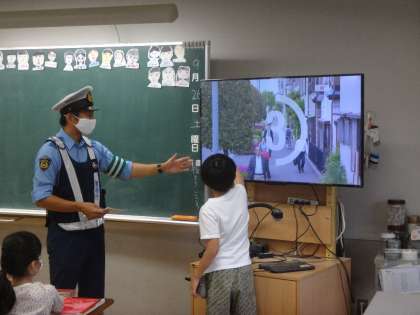 「ヘルメットをかぶっていない。」「交差点で左右の確認をしてない。」など、映像を見て安全のマナーが守れていない様子を次々に見付けて、発表する姿がたくさん見られました。とくに、乗る前の点検をすることに気付いたことには、警察の方から「すごいね、よく知っているね。」とほめられました。とても嬉しいことですね。学習後には、講習修了証をもらい、しっかりとマナーを身に付けられたことと思います。これからも自転車に乗る機会があると思いますが、安全に、楽しく乗ってほしいです。