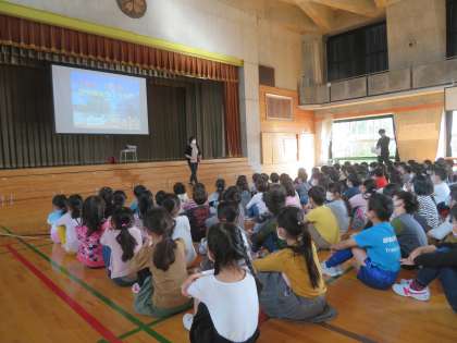 写真がスクリーンに表示されると「すごいね。」、「きれい。」と歓声が上がりました。紹介された子に話を聞くと、「戻す時に同じ場所に戻しておくからいつもきれいにできる」ということでした。