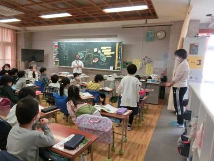 授業のはじめでは「のびのびとは、どういうことかな」という問いかけに子どもたちは「気持ちいい」「昼寝しているとき」「体操しているとき」など自分の好きなことを自由にしていることをイメージしました。