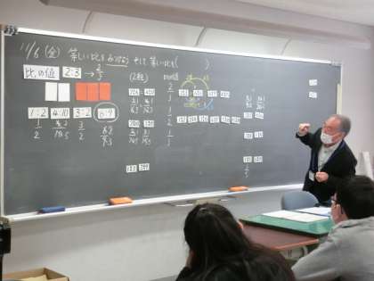 ゲーム後に等しい比を集めて気付いたことを検討することで、前項の数と後項の数が比例関係になっていることが分かり、これを活用することで等しい比を見つけるだけでなく、作ることもできるのではないかと展開しました。実際に等しい比を作ってみることで本時の学習のめあてを達成することができました。