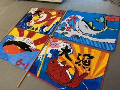 大漁旗作りを担当した子どもたちは、色の塗り方や工夫を考え、協力して旗を作っていました。休み時間や朝の時間を使って一生懸命取り組み、6年生のソーラン節がより活気付く、色鮮やかで素敵な旗ができました。