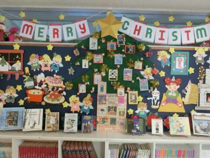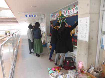 本日、図書室の壁面装飾の保護者のボランティアの皆様による「クリスマス バージョン」が完成しました。