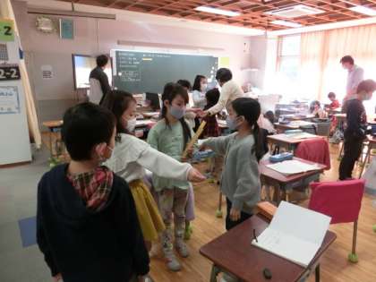 友だちと考えを出し合う→まずやってみる→もっとうまくいく方法を考える→やってみる→解決できた…という主体的で対話的な活動ができていました。